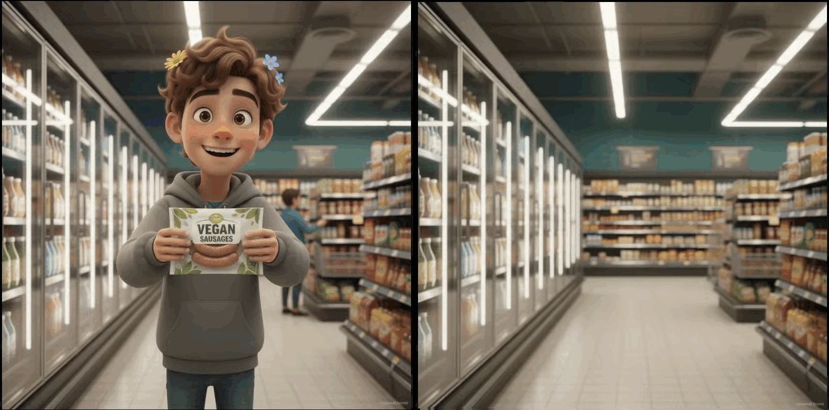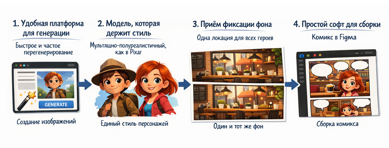 Это суть всей схемы. Проблема большинства генераций в том, что «мальчик в магазине» и «кот в магазине» оказываются в двух разных магазинах: модель каждый раз дорисовывает фон заново. Чтобы сцены выглядели, как один комикс, нужно зафиксировать фон.