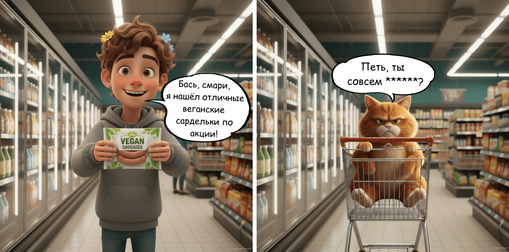 Сюжет: Петя нашёл веганские сардельки и делится радостью с Басиком. Петя — радостный, Басик — токсичный.