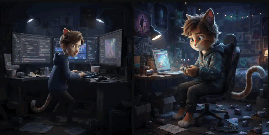 4. Отдельная фишка — персонажи-гибриды. Например, кот Басик — это изначально «мальчик-кот с милой и необычной внешностью в стиле Pixar, картинка в тёмных тонах, он делает компьютерную игру».