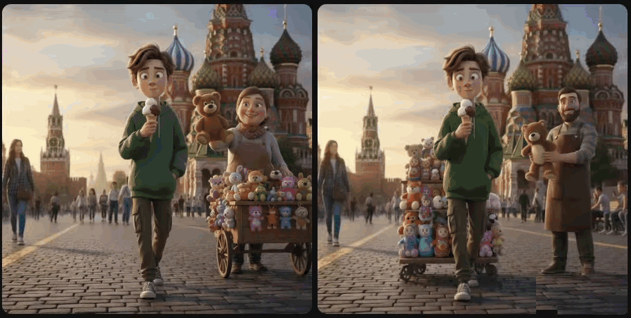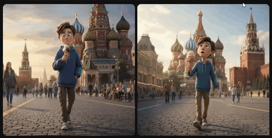 1. Стартовый промт: «Нарисуй подростка, любознательного. Стиль Pixar, полуреализм. Он гуляет по Красной площади и ест мороженое». Почему именно так: