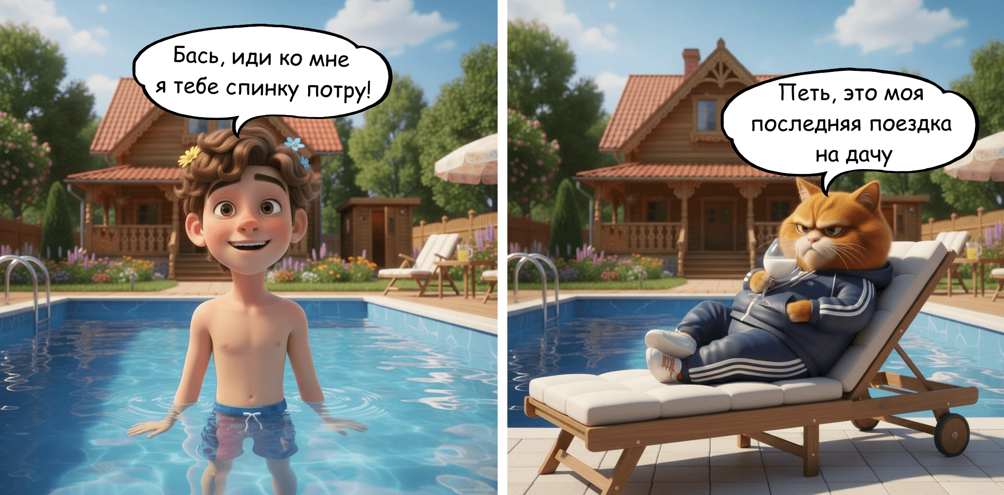 - Рисуем Петю на русской даче, он в бассейне, радостный, лето.