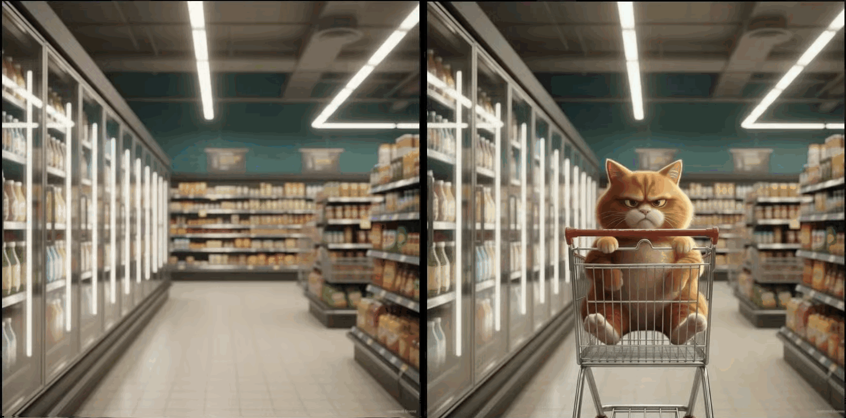 3. Теперь прикрепляем этот пустой фон, второго героя (Басика) и пишем: «Нарисуй, как кот сидит в тележке с недовольным лицом. Всё происходит у холодильников с предыдущей фотографии». Модель понимает, что фон задан, и не выдумывает свой.