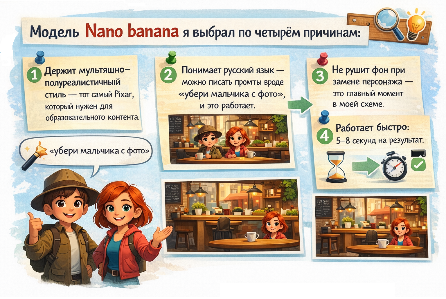 В какой-то момент я столкнулся с проблемой, знакомой многим авторам учебного контента: курсу нужны десятки и сотни иллюстраций. Случайные картинки из интернета не подходят — это должна быть настоящая визуальная вселенная с постоянными персонажами, узнаваемыми локациями и мини-историями, которые раскрываются на протяжении всего материала.